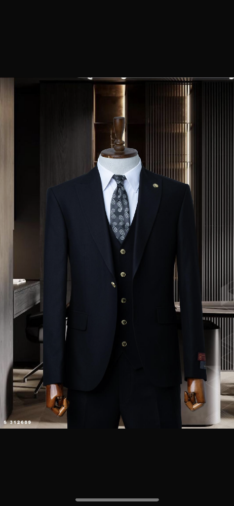 ist ein dreiteiliger Herrenanzug in Schwarz, bestehend aus Sakko, Weste und Hose, kombiniert mit einem weißen Hemd und einer gemusterten Krawatte
