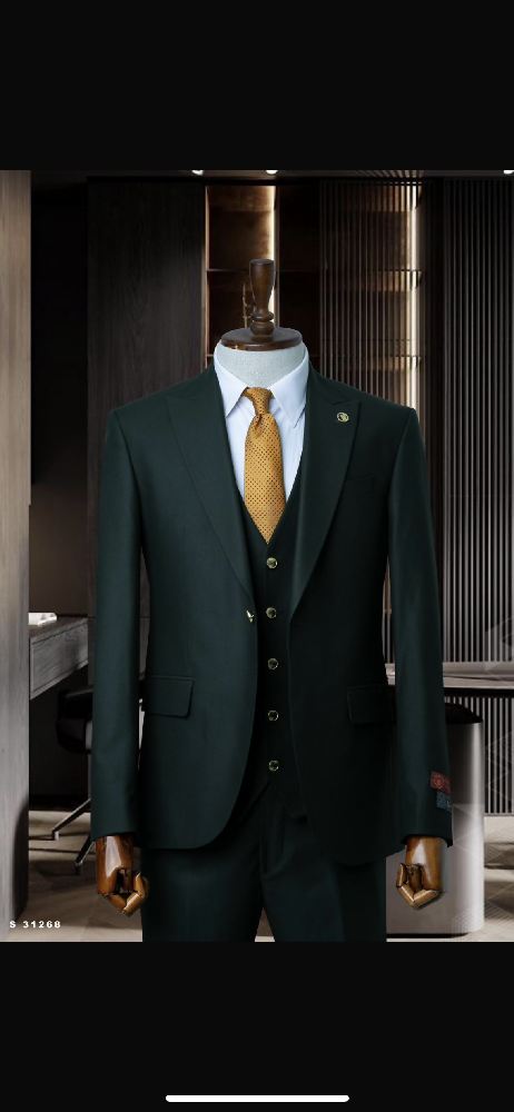 ist ein dunkelgrüner Anzug für Herren, bestehend aus Sakko, Weste und Hose, kombiniert mit einem weißen Hemd und einer senfgelben Krawatte
